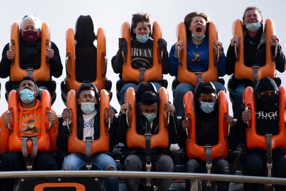 People enjoy the attractions at Alton Towers in Staffordshire, as England takes another step back