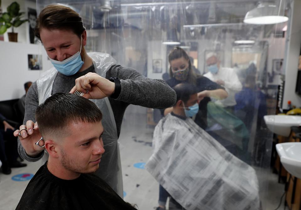 People get their hair cut at a busy hairdressers in London, set up with protective equipment to