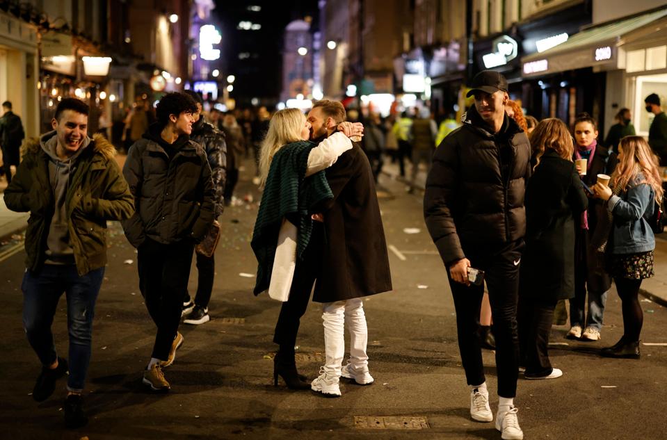 A couple kiss in the street as people start to leave Soho as pubs and restaurants close